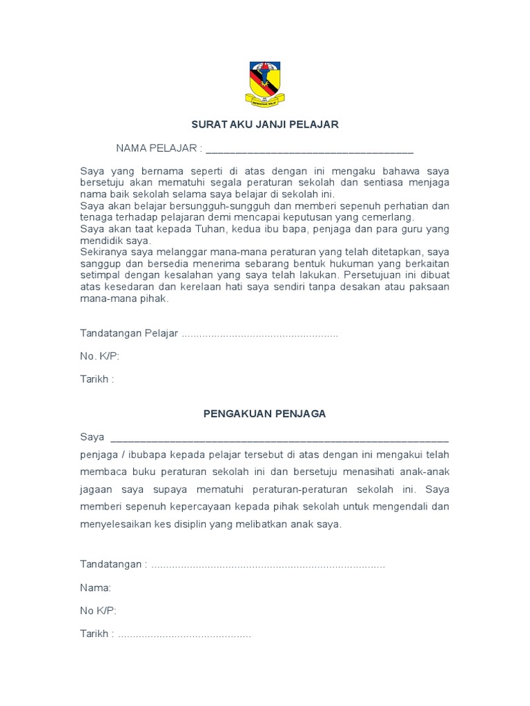 Saya yang bernama seperti di atas dengan ini mengaku bahawa saya bersetuju akan mematuhi segala peraturan sekolah selama saya belajar di sekolah ini. Siswa di sini mayoritas semuanya orang aceh,dalam bergaul terkadang aku. Saya yang bernama seperti di atas dengan ini mengaku bahawa saya bersetuju akan mematuhi segala peraturan sekolah selama saya belajar di sekolah ini. Sekiranya saya melanggar mana mana peraturan yang telah ditetapkan. ** jika anak berumur 18 tahun ke atas hendaklah menandatangani surat aku janji. Instagram sfikir20 #sfikir #view #subscribe video ni sebenarnya utk pertandingan pe ntah comment la ni video 1st yg kami buat sama2 thanks kengkawan. Cahaya islam 3 months ago. Janji pelajar muhammadiyah adalah ikrar yang dipegang teguh oleh pelajar yang bersekolah di sekolah muhammadiyah dan juga anggota serta aktivis ikatan pelajar muhammadiyah. Surat aku janji by helmi suhana 6173 views. Pengajian tinggi (kpt) mesir / jordan dan kuota yang telah diperuntukan. Sesungguhnya dan sebenarnya berjanji bahawa saya akan berusaha untuk sedaya upaya untuk mencapai kecemerlangan dalam ilmu dan akan sentiasa mempertingkatkan budi pekerti yang mulia. Adalah dari kumpulan saya sesungguhnya faham bahawa jika saya disabitkan kerana melanggar aku janji ini, saya boleh dikenakan tindakan yang akan diputuskan oleh pengurusan selfuel. Simulasi rutin harian pelajar asrama.